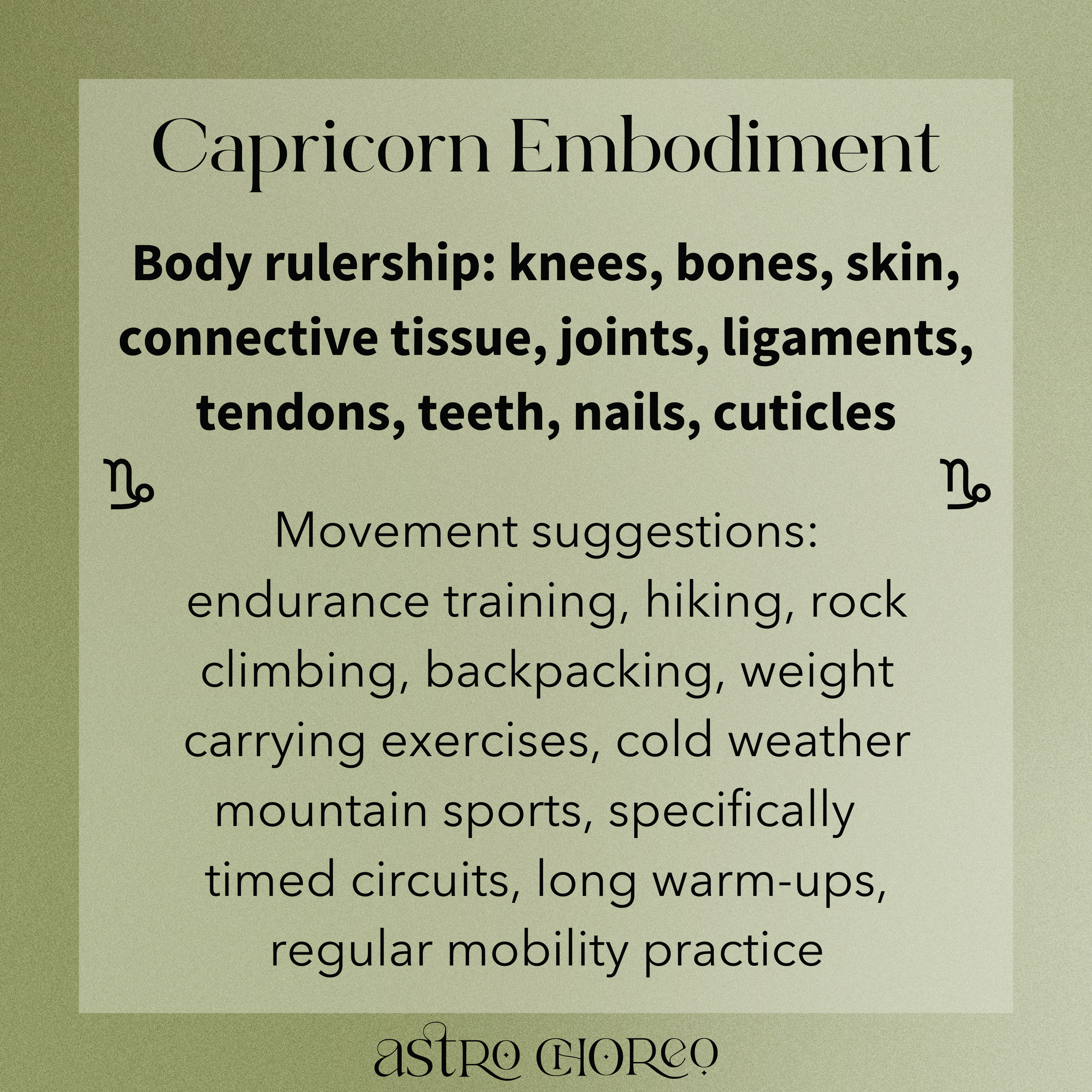 Body rulership: knees, bones, skin, connective tissue, joints, ligaments, tendons, teeth, nails, cuticles