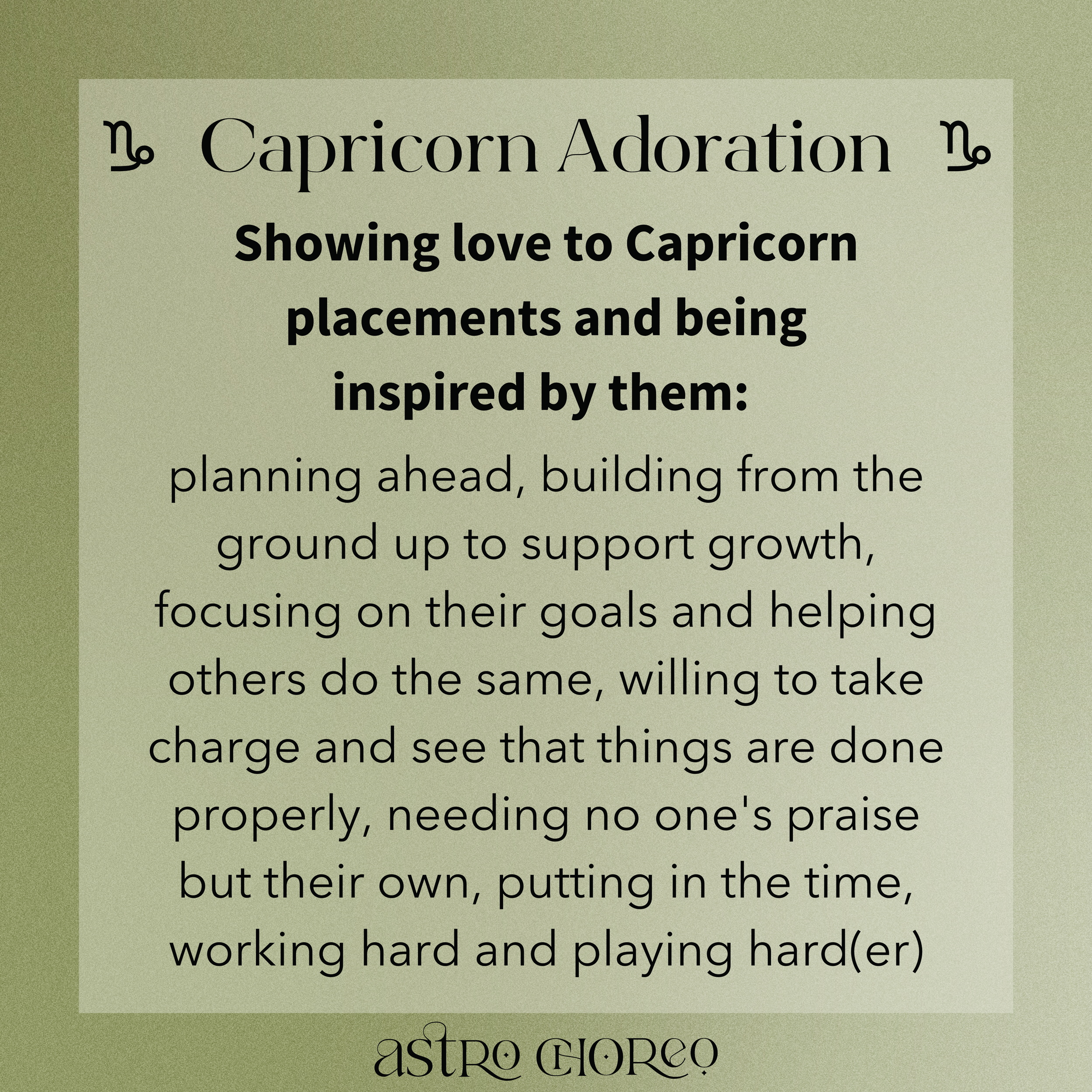 Showing love to Capricorn placements and being inspired by them: planning ahead, building from the ground up to support growth, focusing on their goals and helping others do the same, willing to take charge and see that things are done properly, needing no one’s praise but their own, putting in the time, working hard and playing hard(er)