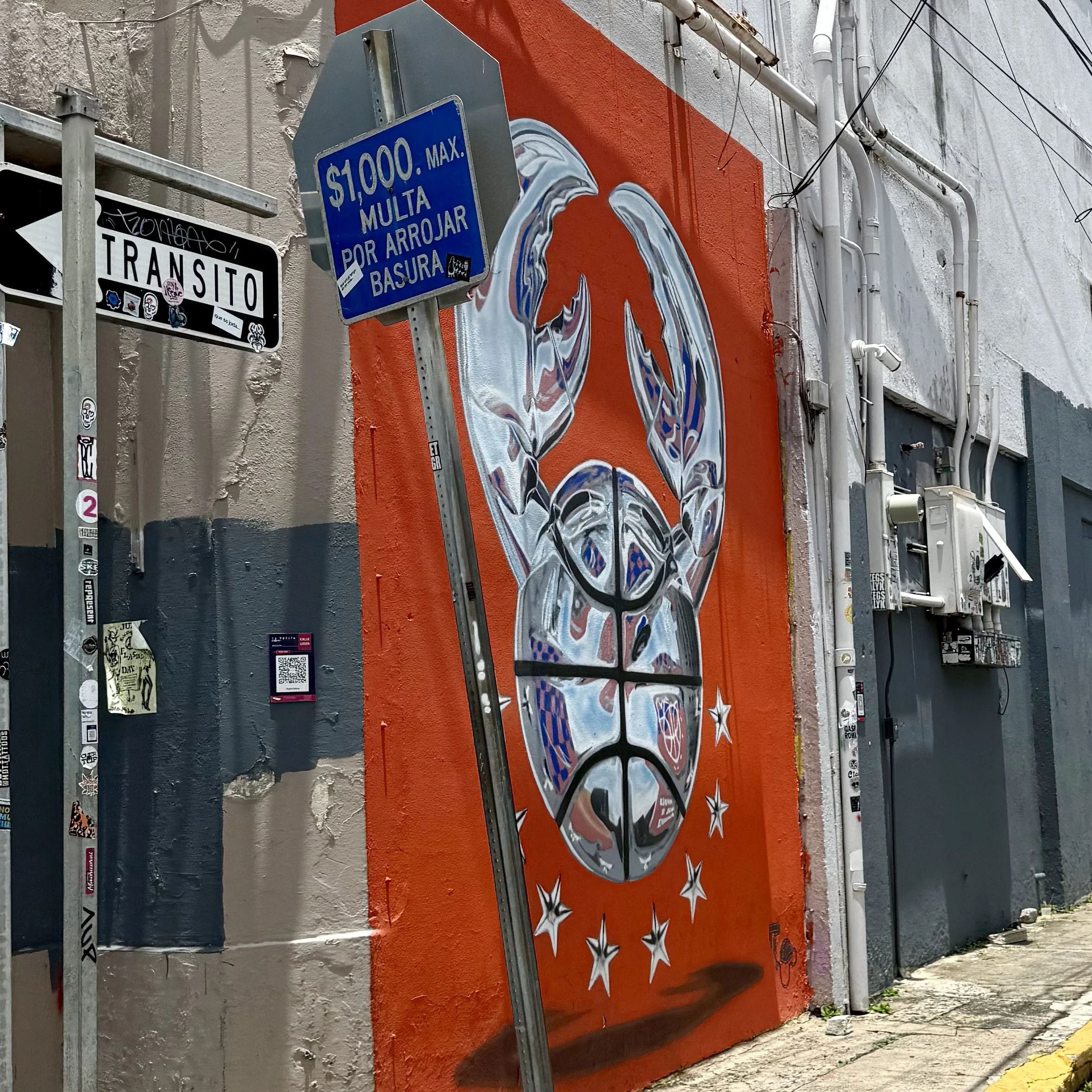 Days before, while talking about the operation, passing a mural of a shiny crab…