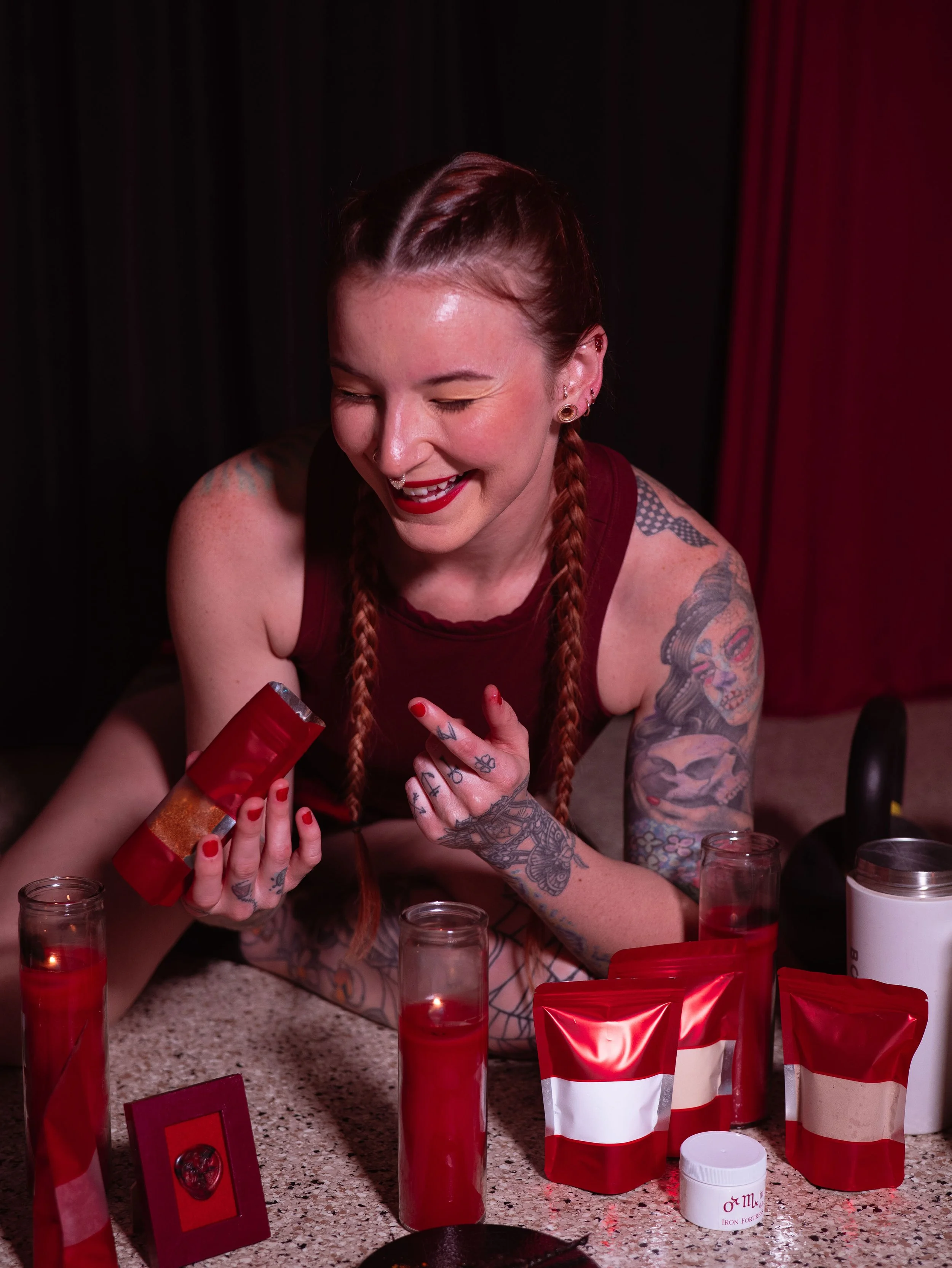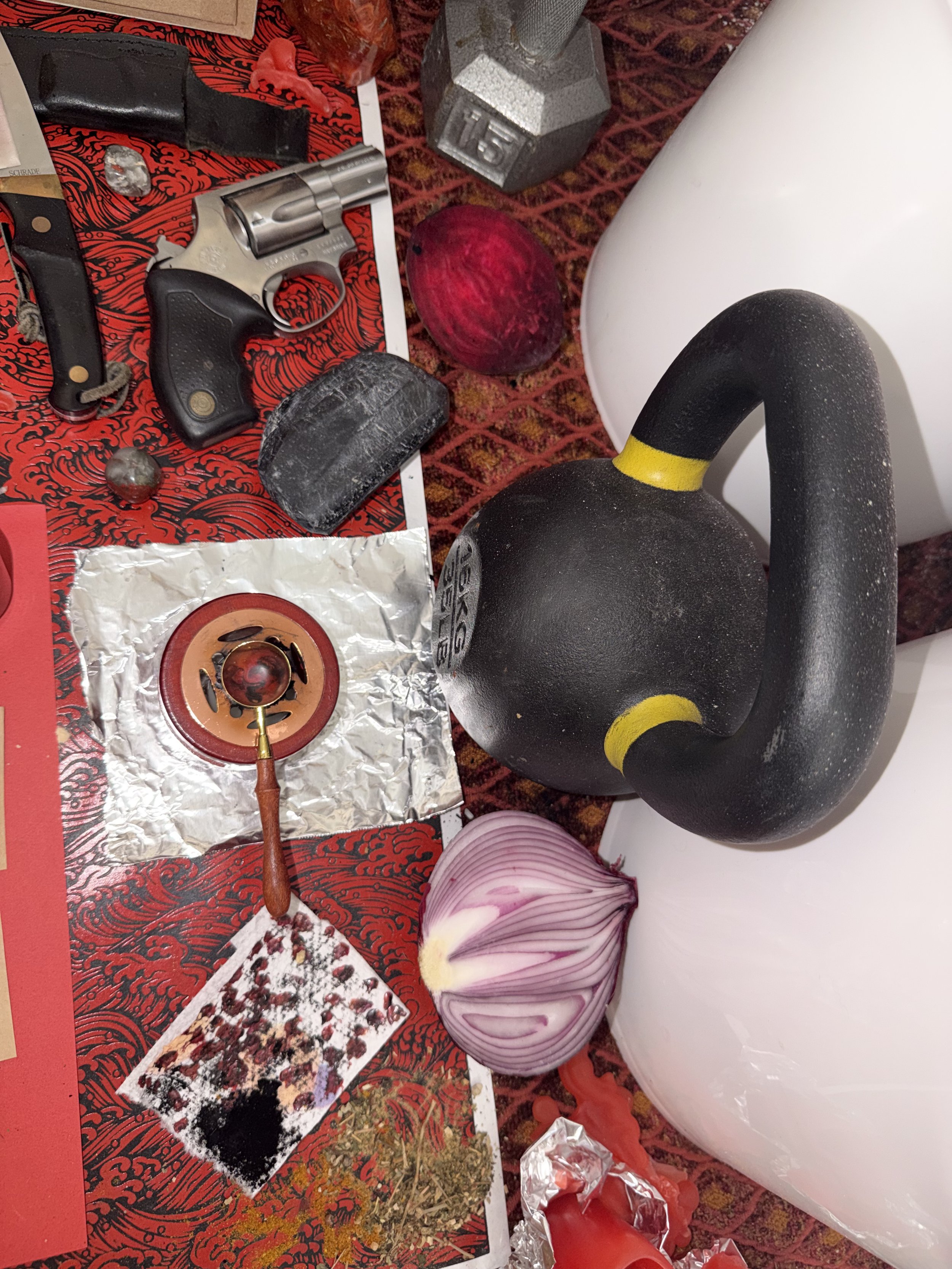Considering the specific nature and intentions, I brought in my dumbbells and kettlebells for the altar and rooted the operation to a 5lb plate that I engraved with the Mars and Scorpio glyphs and 5x5 magic square of Mars.