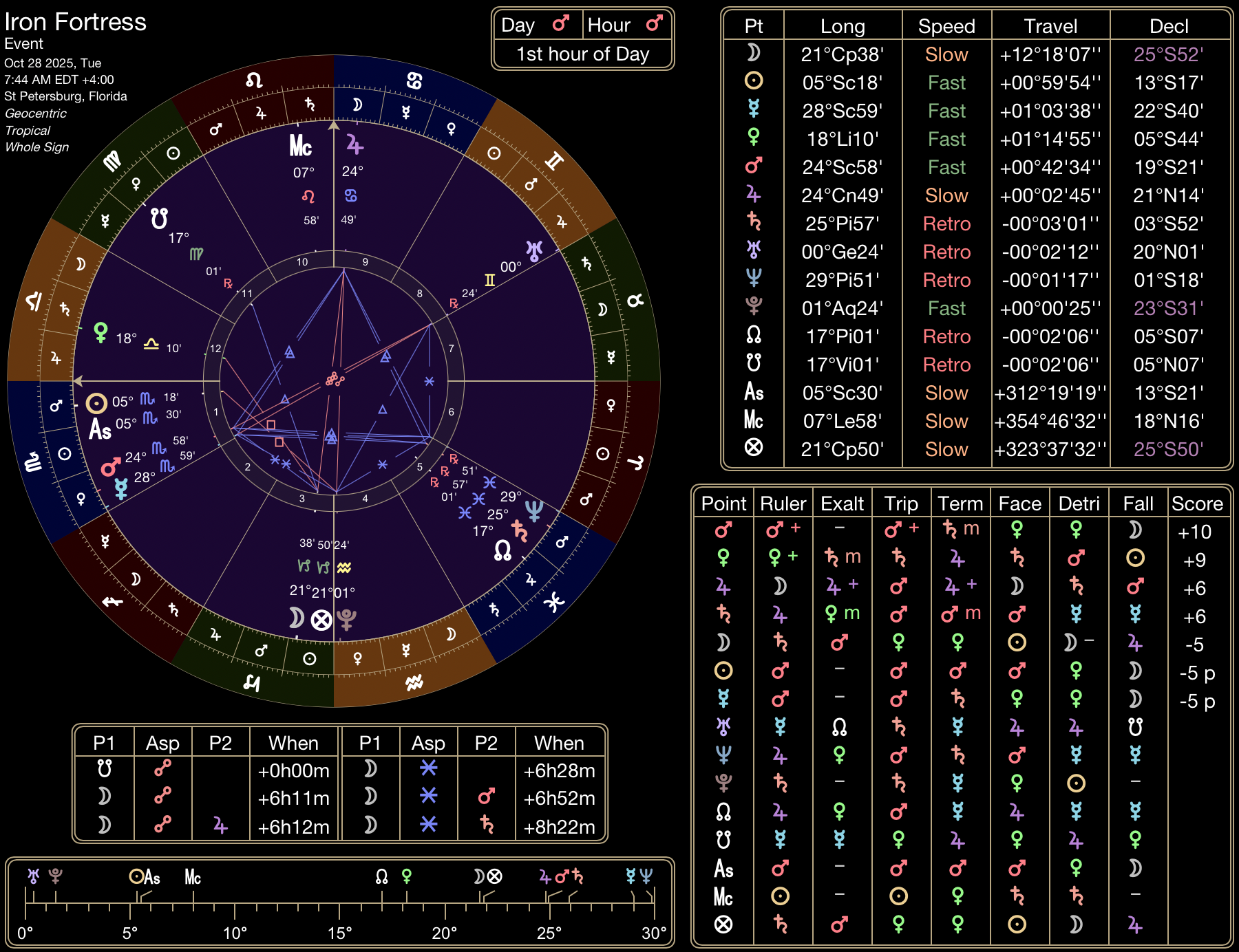 Mars is in domicile in Scorpio in the 1st House, underneath the horizon at sunrise during Mars hour on Mars day. Very classic and straightforward target planet in the 1st on their day and hour. Mars is more malefic by day as the Sun exacerbates heat, so the ritual was completed when the Ascendant reached 14º, a full 10 degrees above Mars to temper.
