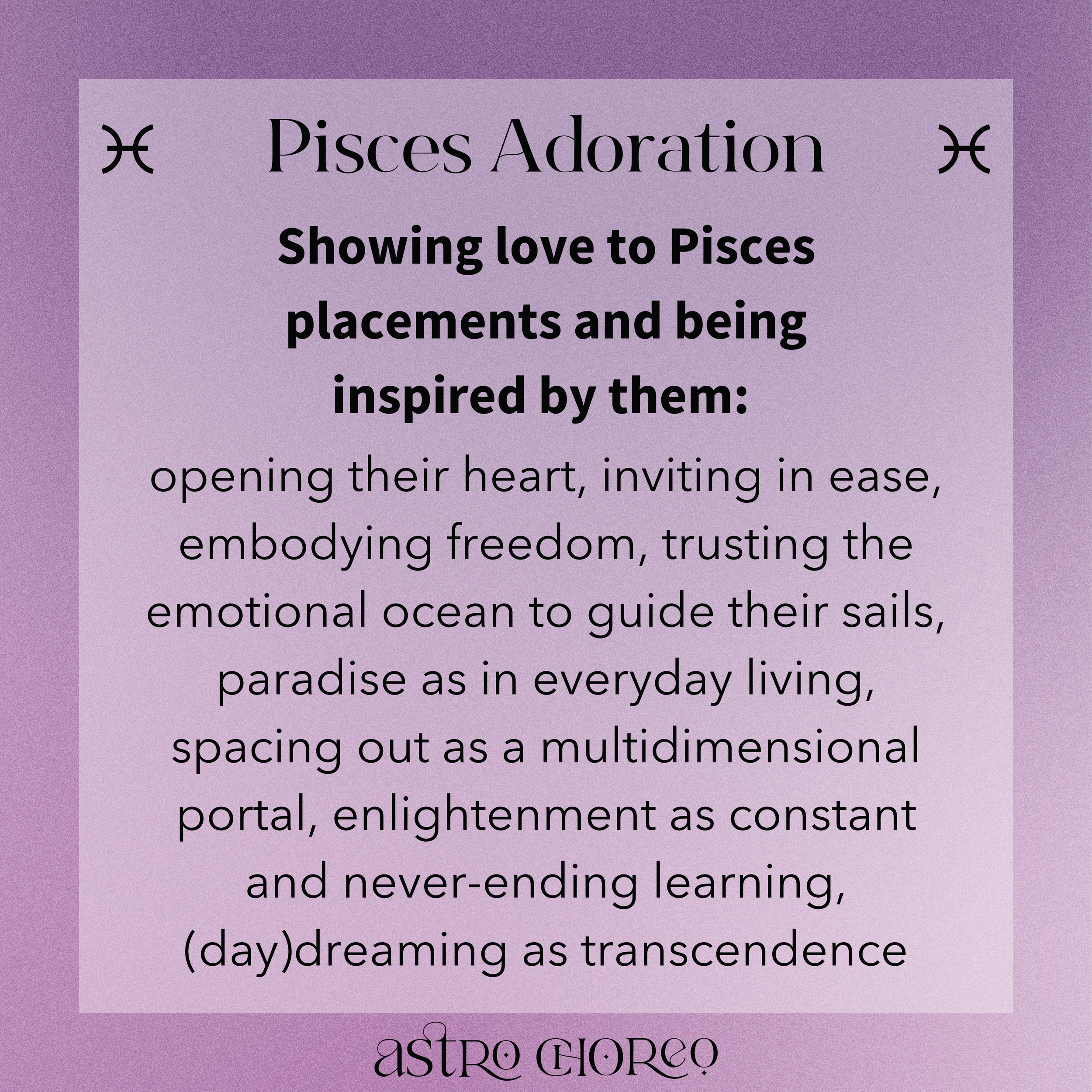 Showing love to Pisces placements and being inspired by them: opening their heart, inviting in ease, embodying freedom, trusting the emotional ocean to guide their sails, paradise as in everyday living, spacing out as a multidimensional portal, enlightenment as constant and never-ending learning, (day)dreaming as transcendence