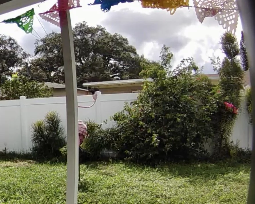 A video screenshot showing the tallest one on the very right side of the frame which reaches far higher than the 6 foot white fence, a couple on the left that are smaller and ended up growing sideways, and sandwiched in the middle is a bougainvillea