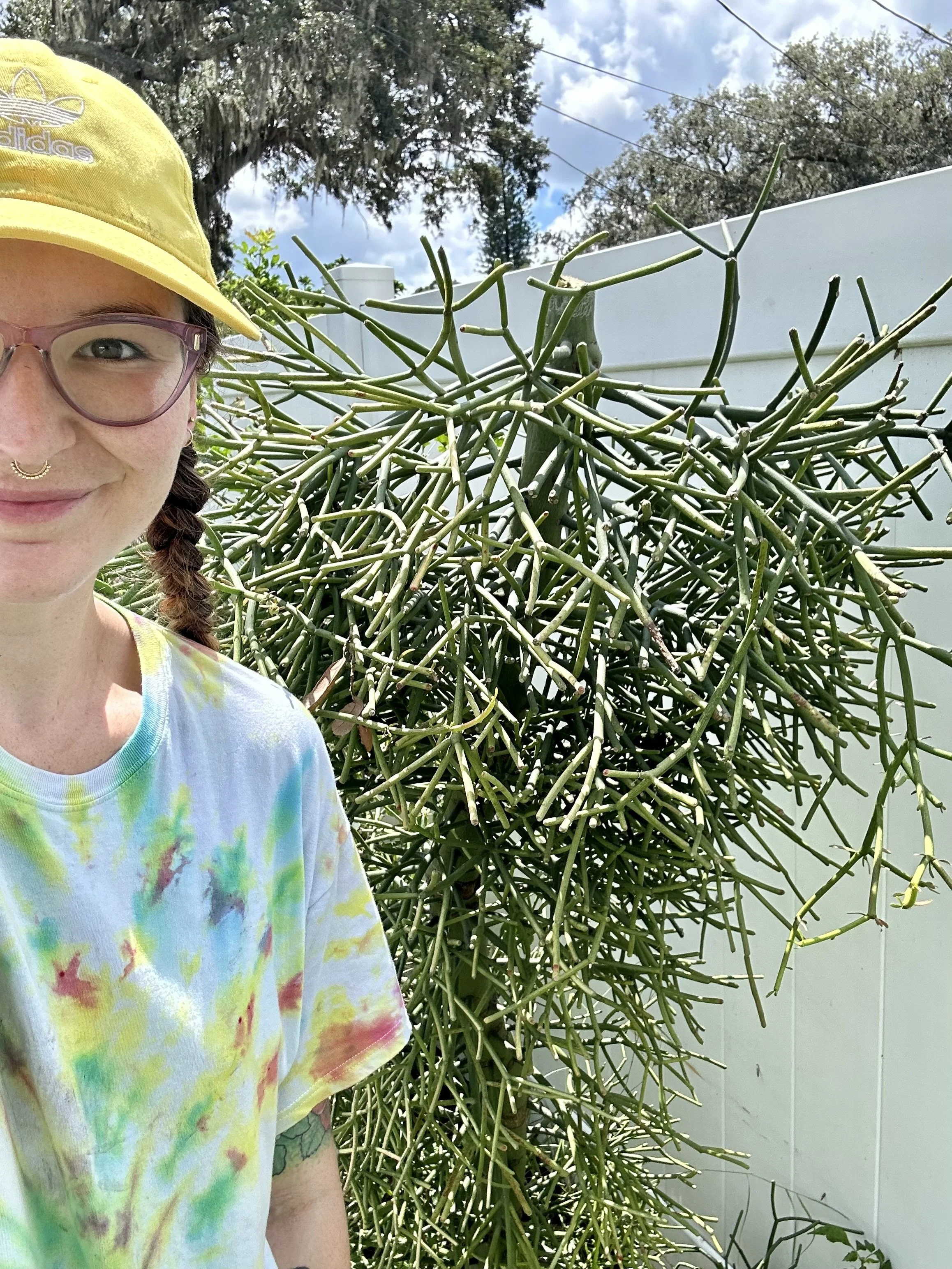 A selfie I took standing next to the biggest fire stick in my back yard shortly after trimming it to propagate in the front yard, and it’s still roughly as tall I am