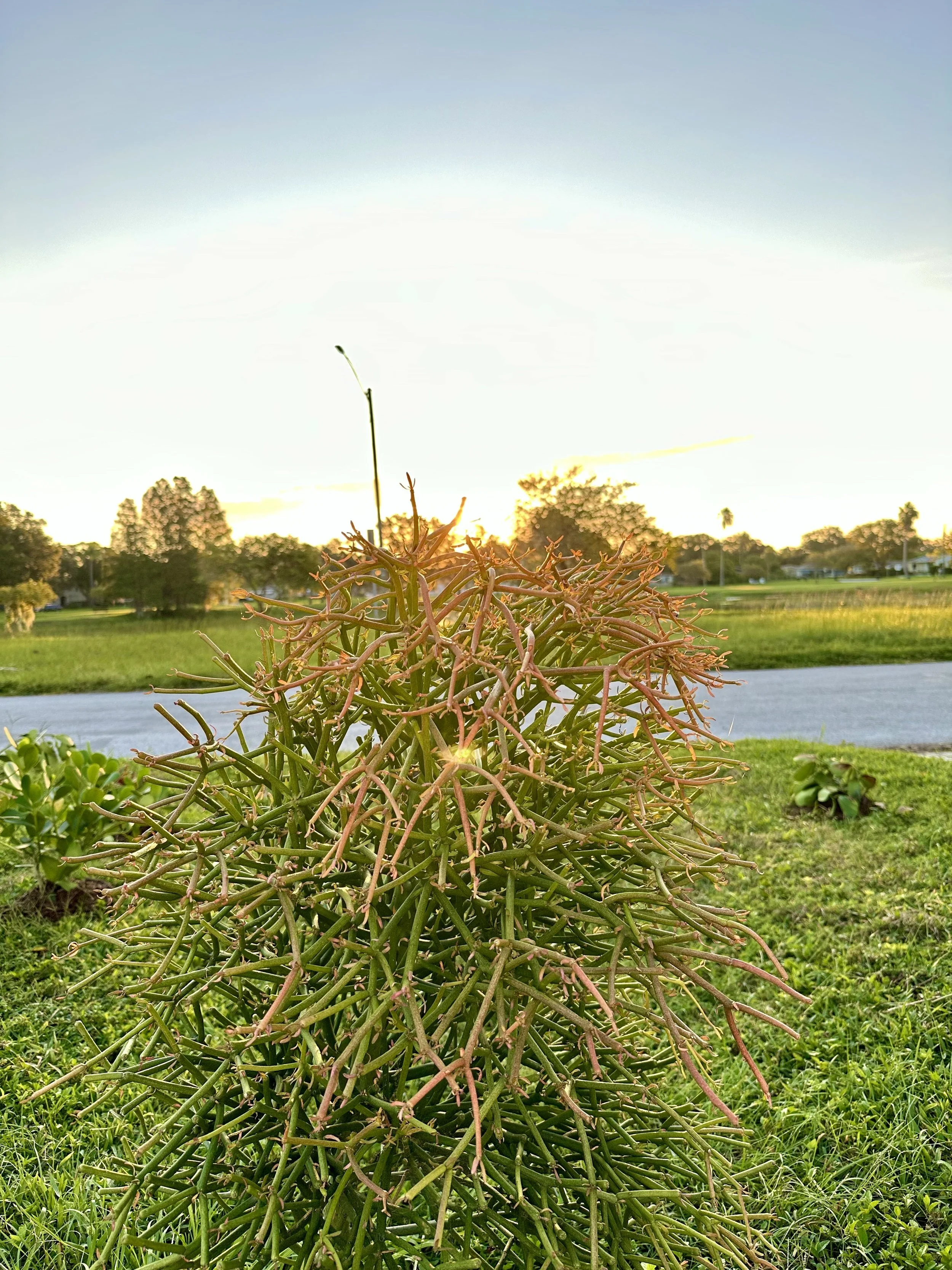 The plant I was letting go wild is called Euphorbia Tirucalli, also referred to as pencil cactus or what they were introduced to me as: fire sticks. They have “fingers” or “sticks” that outstretch from the thick stem and change color depending on environment.