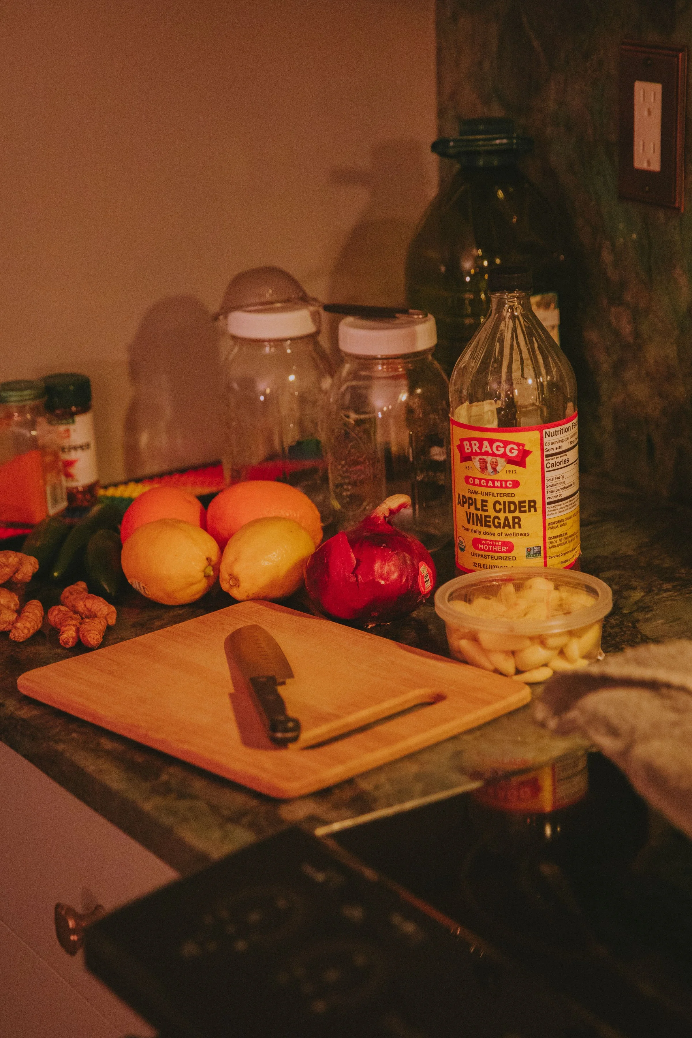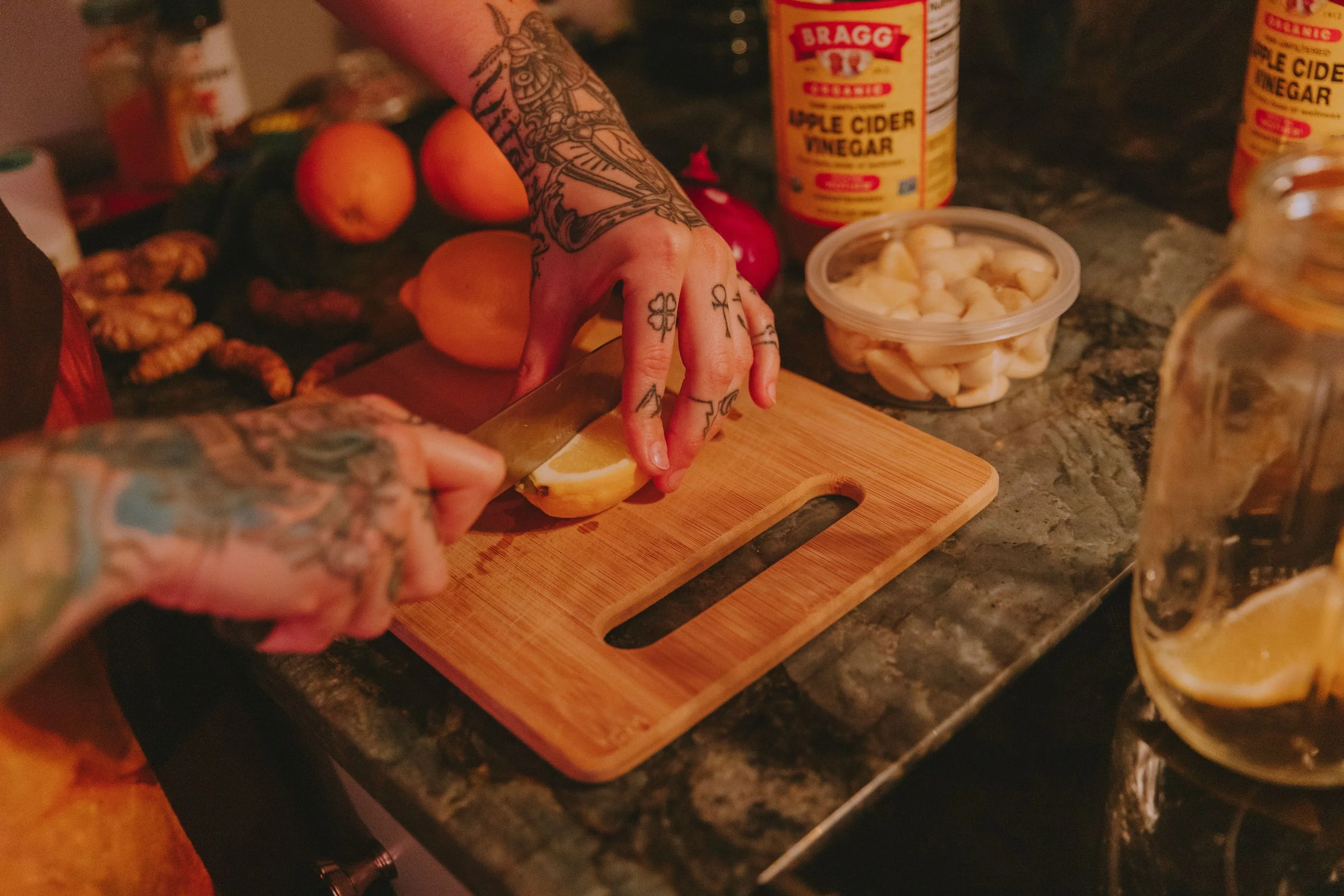 Three images of a cutting board with a sharp knife along with ingredients like red onion, lemons, oranges, garlic, turmeric, jalapeño peppers, and apple cider vinegar; the third photo shows me slicing a lemon